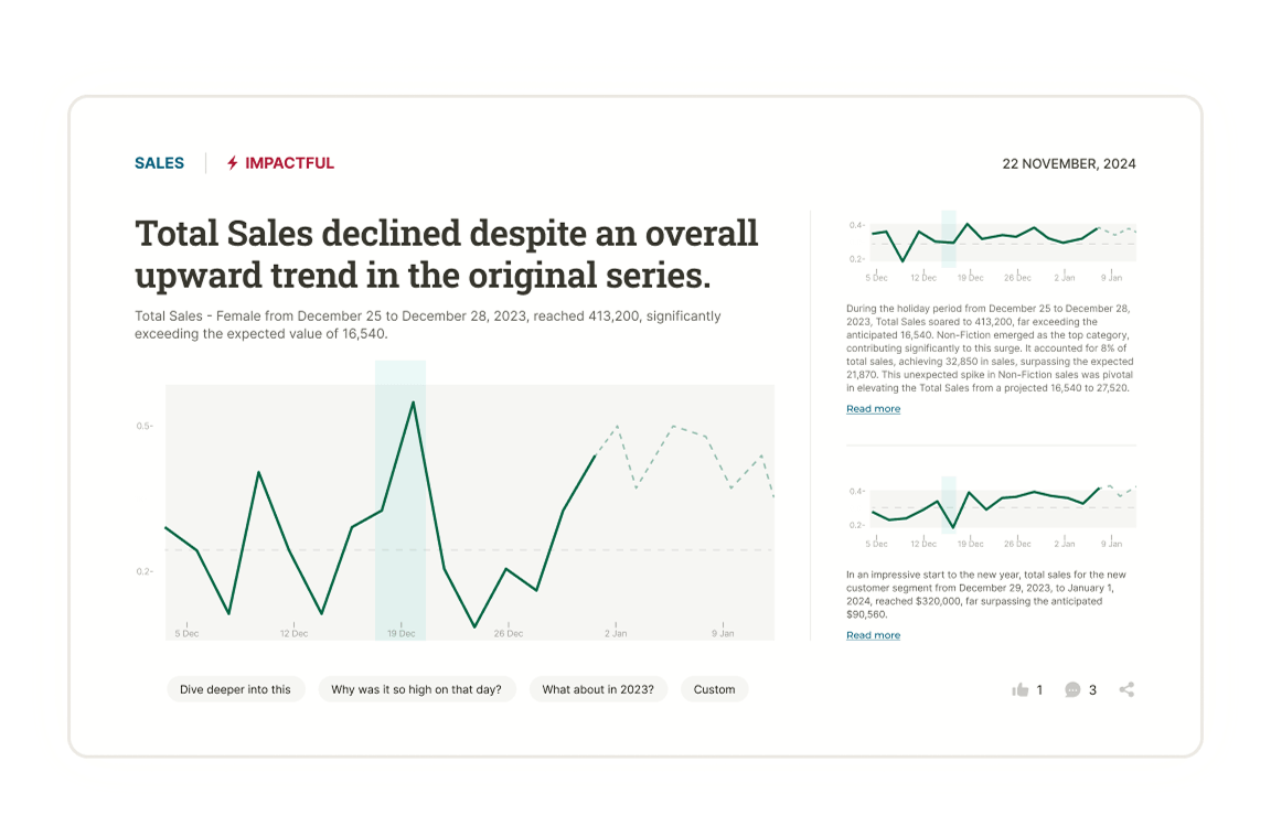 - Insight Flow: No more static insights! PetaSight Insights will carefully curate your insights so that you see a streamlined narrative that evolves with your data. If you saw an insight before, you won’t see it again unless it becomes significant once again. You thus only ever see only the most relevant and impactful insights.