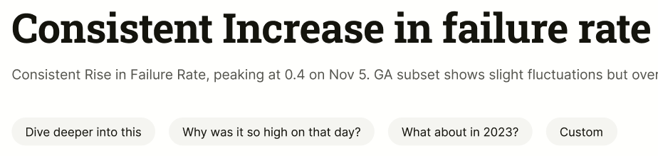 - Personal Queries: Free-form queries to dive deeper into a particular insight. PetaSight Insights will generate the top 3 follow-up queries that require investigation. (In a future release, we will also allow “Co-Pilot” functionality, or free-form querying of the Insight.)